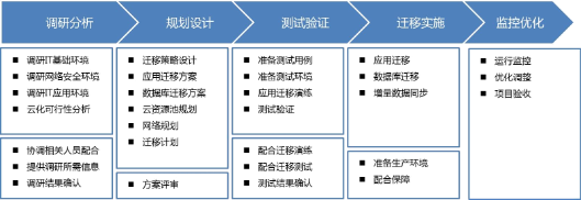 结合客户业务系统特点,制定业务上云流程。通过调研分析、规划设计、测试验证、迁移实施、监控优化五大迁云流程,确保后续客户业务顺利有序地迁移到华为公有云平台。